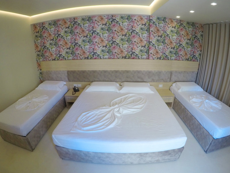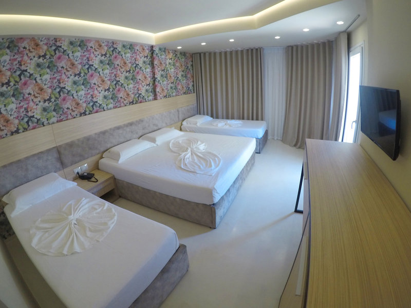 - Quadruple Room with balcony (DZX3), Nichtraucherzimmer, im Hauptgebäude, Meerseite, Meerblick, Innenhofblick, ca. 25 m², letzte Komplettrenovierung 2018, Gesamtanzahl der Räume in diesem Zimmertyp: 9, 2 Einzelbetten, 1 Doppelbett, Klimaanlage: individuell regelbar, Heizung: individuell regelbar, Fußboden: Fliesenboden, Safe, Schreibtisch, Minibar, Telefon, Internet: WLAN/WiFi: ohne Gebühr, Fernseher: Flatscreen, Roomservice, Badewanne oder Dusche, Dusche, Slipper, Föhn, Balkon oder Terrasse