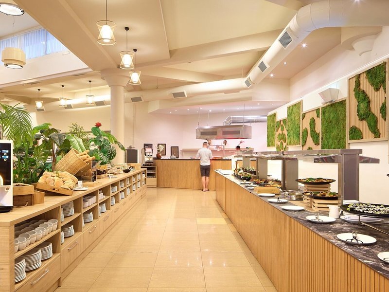- Hlavná reštaurácia formou bufetu: Kuchyňa: medzinárodná, stredomorská, ľahké jedlá: v cene all inclusive, rezervácia nie je potrebná, bufet, show cooking, rezervácia nie je potrebná, v cene all inclusive, klimatizácia, vysoká stolička