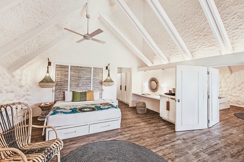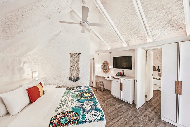 - 71-80 qm, Suite, Erdgeschoss, Nichtraucher, separater Wohnraum, 2 Doppelbetten, 1 Bad, Dusche, Badewanne, Haartrockner, Fliesen, Klimaanlage, individuell regulierbar, Ventilator, Minibar kostenpflichtig, Safe, TV (Sat-TV), Kaffee/Tee, Terrasse (möbliert), Butlerservice, separater Strandbereich