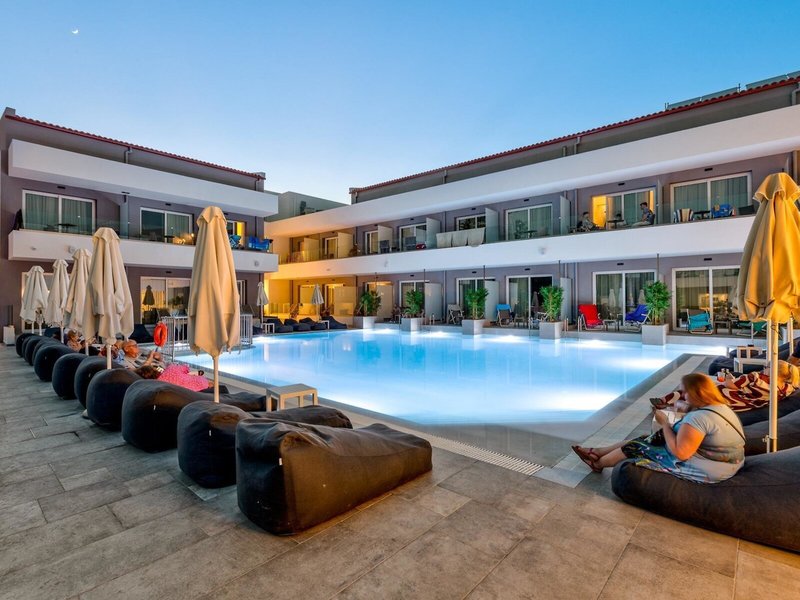 Lage & Umgebung Die Hotelanlage befindet sich auf der griechischen Insel Zakynthos nahe dem Zentrum des beliebten Ferienortes Laganas mit seinen lebhaften Bars und Tavernen. Etwa 250 m sind es zum langen feinsandigen Strand, der zum Baden, zu Bootstouren, Spaziergängen oder Wassersport einlädt.