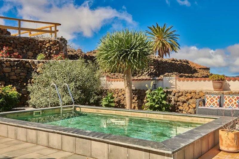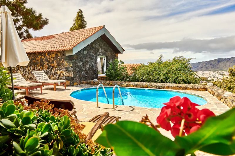 Vila Superior 2 spálne súkromný bazén: Vila (cca 120 m²) má plne vybavenú kuchyňu, 2 spálne a 2 kúpeľne, obývaciu izbu a jedáleň. Záhrada (cca 350 m²) má vlastný bazén, krytú terasu a vyvýšenú terasu s panoramatickým výhľadom na more a údolie Aridane (V2U/"El Olivo").