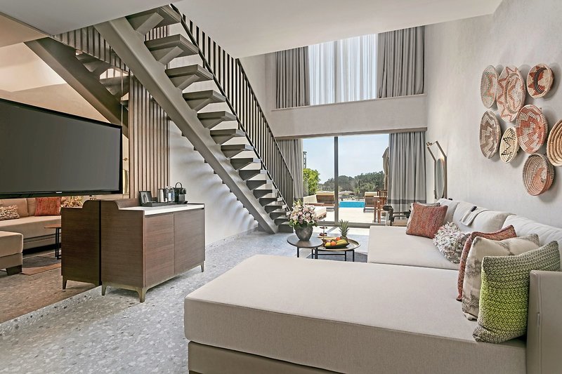 - 91-100 qm, Familien, mit Verbindungstür, Golfplatzblick, Poolblick, 2 separate Schlafzimmer, 2 Einzelbetten, Doppelbett, Sofabett, 2 Bäder, Dusche, WC, Bademantel, Badeslipper, Haartrockner, Kosmetikspiegel, Fliesen, Klimaanlage, zentral gesteuert, Minibar, Auffüllung täglich, Softdrinks, Mineralwasser, Bier, Säfte, Hauswein, Wasser, Snacks, Safe, Bügelbrett, Bügeleisen, TV (Sat-TV, Flachbildschirm), Wasserkocher, Espressomaschine, Kaffee/Tee, Terrasse (möbliert), direkter Poolzugang, Gemeinschaftspool, hochwertige Badartikel, Frühstück, bei Ankunft im Zimmer Obstkorb, Snacks