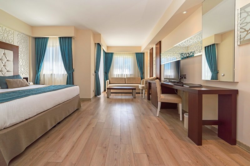 - 31-35 qm, Doppel, Hauptgebäude, Meerseite, Meerblick (zum Teil), Doppelbetten (1 Doppel- oder 2 Einzelbetten), Dusche, WC, Bademantel, Badeslipper, Haartrockner, Laminatboden, Klimaanlage, zentral gesteuert, Minibar, Auffüllung täglich, Safe, TV (Smart-TV), Wasserkocher, Kaffee/Tee, Balkon