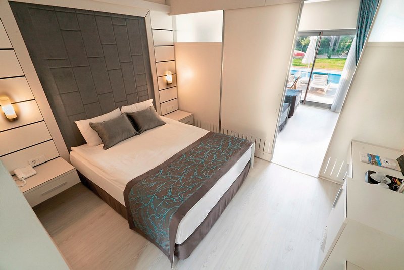 - 31-35 m2, rodiny, so spojovacími dverami, 2 oddelené spálne, jednolôžko, francúzska posteľ, sprcha, WC, fén, klimatizácia, individuálne nastaviteľná, minibar za poplatok, trezor (za poplatok), 1 TV (satelitná TV ), rýchlovarná kanvica, balkón, súkromný bazén